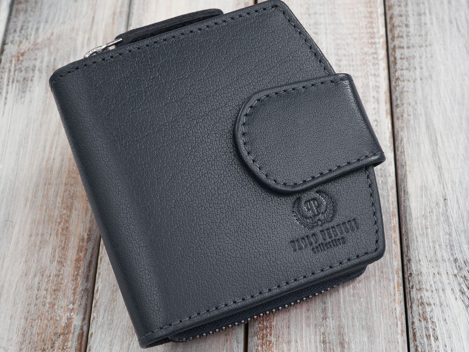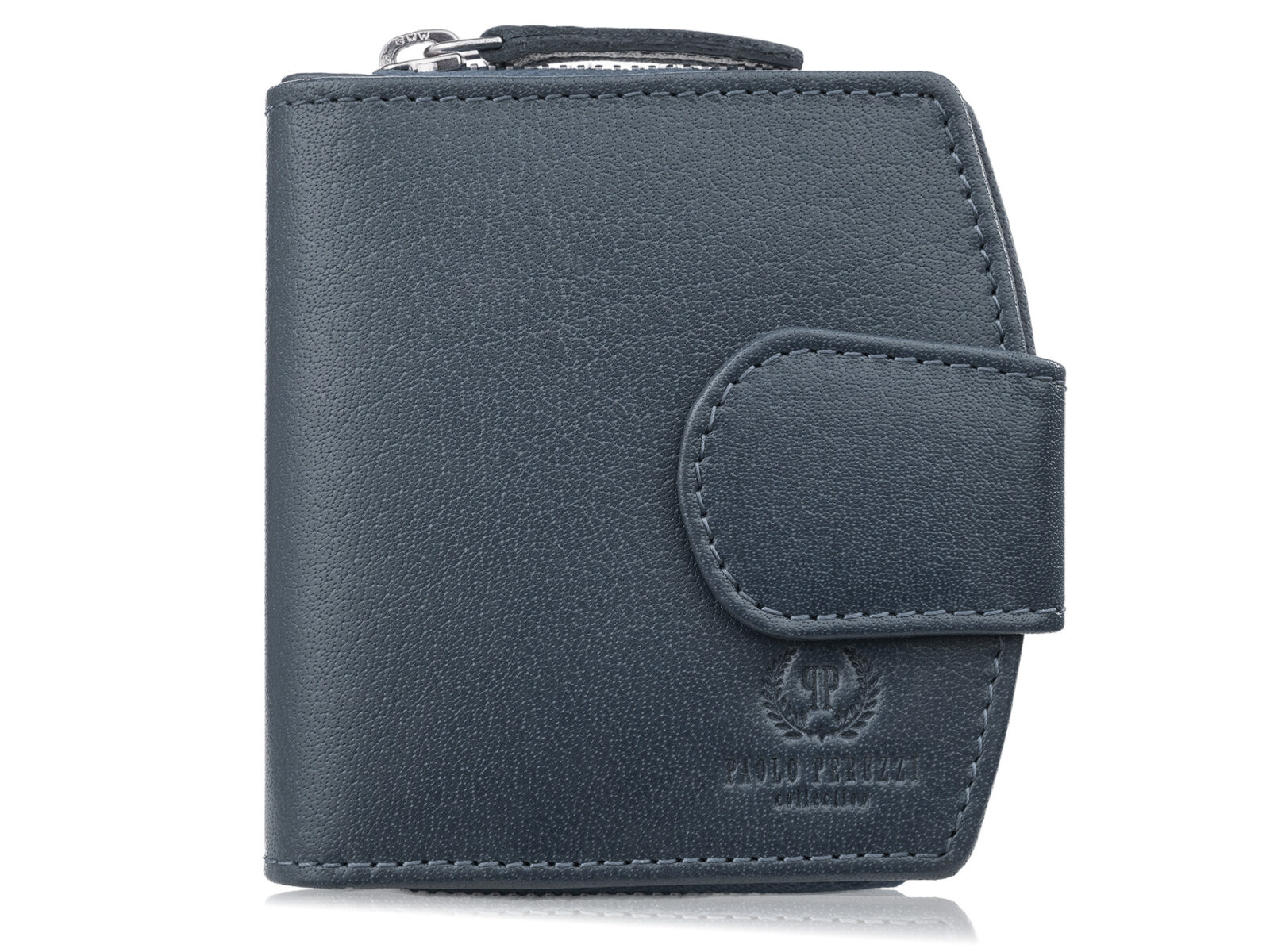 Granatowy portfel damski skórzany średni zapinany na zatrzask i zamek błyskawiczny RFID