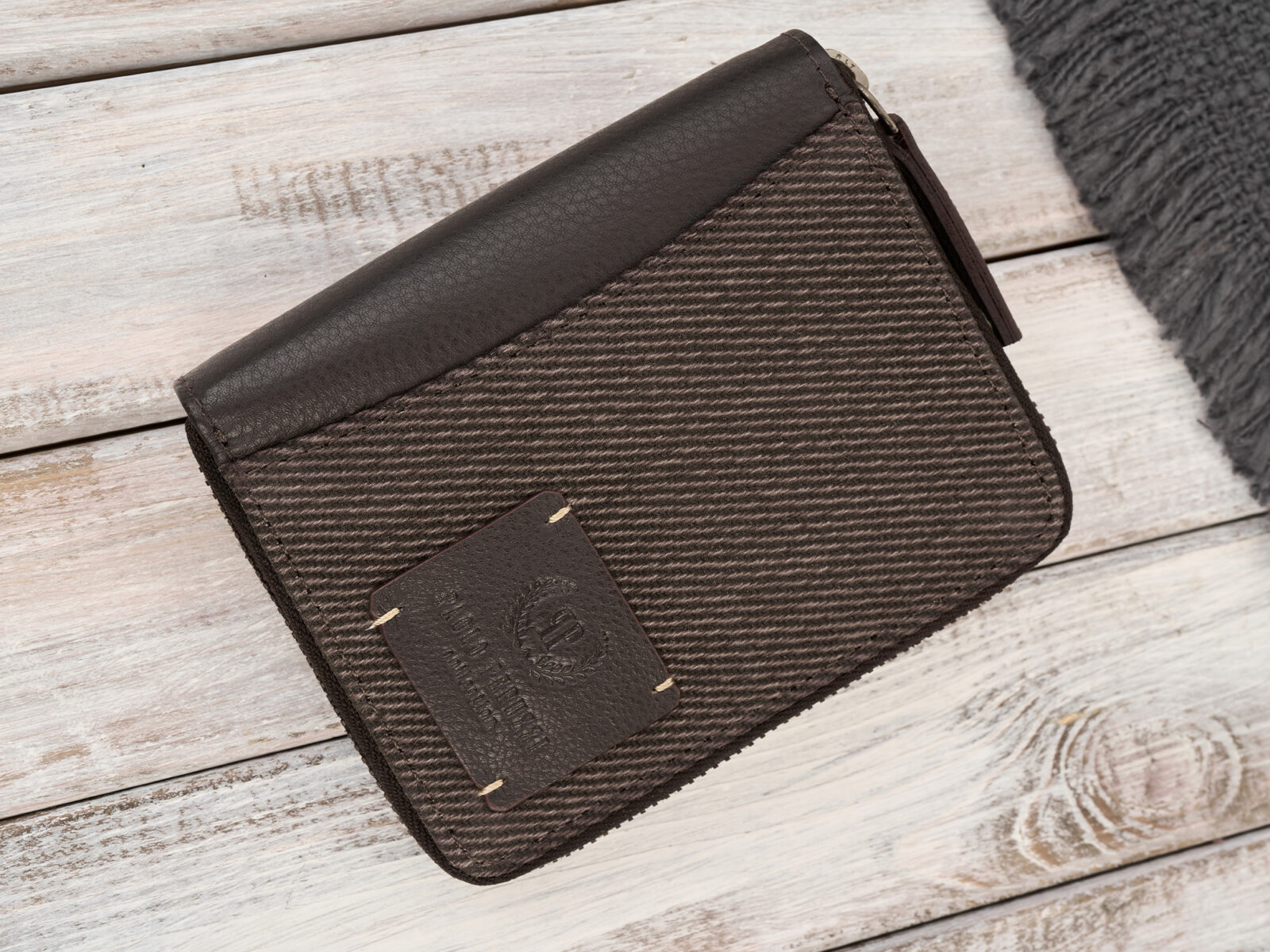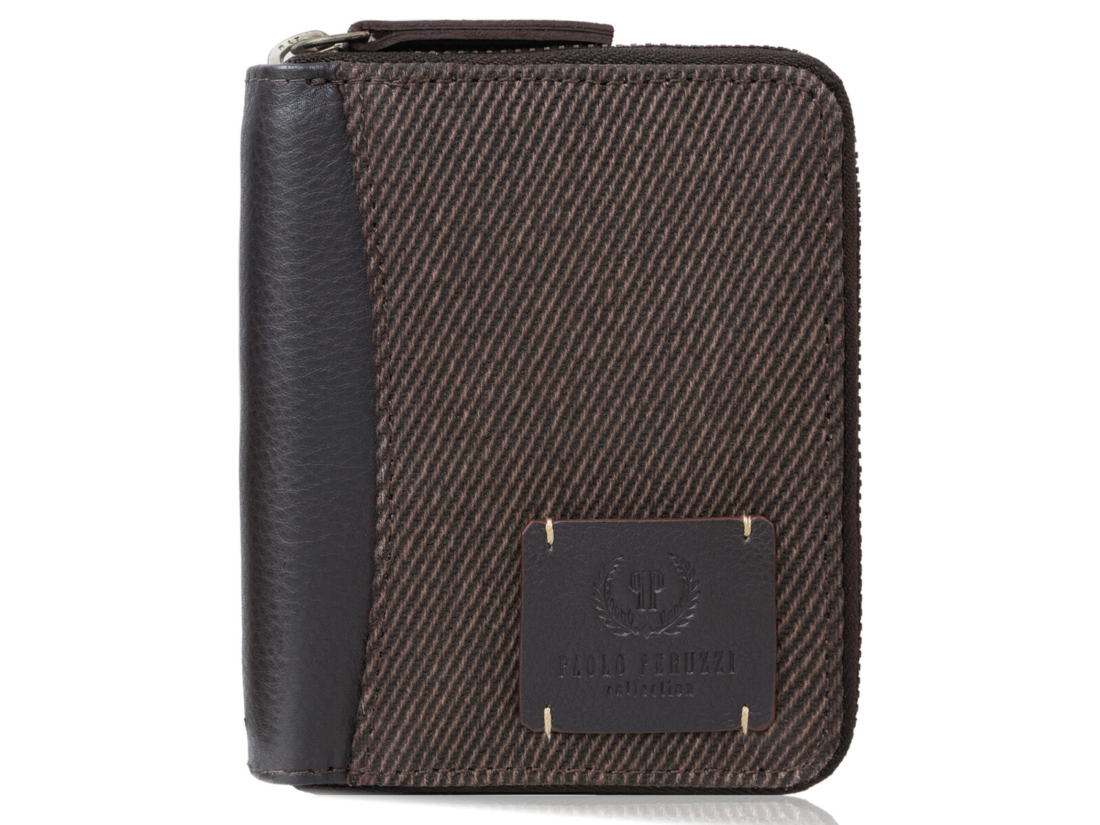 Pionowy, ciemnobrązowy portfel męski zapinany na zamek błyskawiczny, z canvasu i skóry