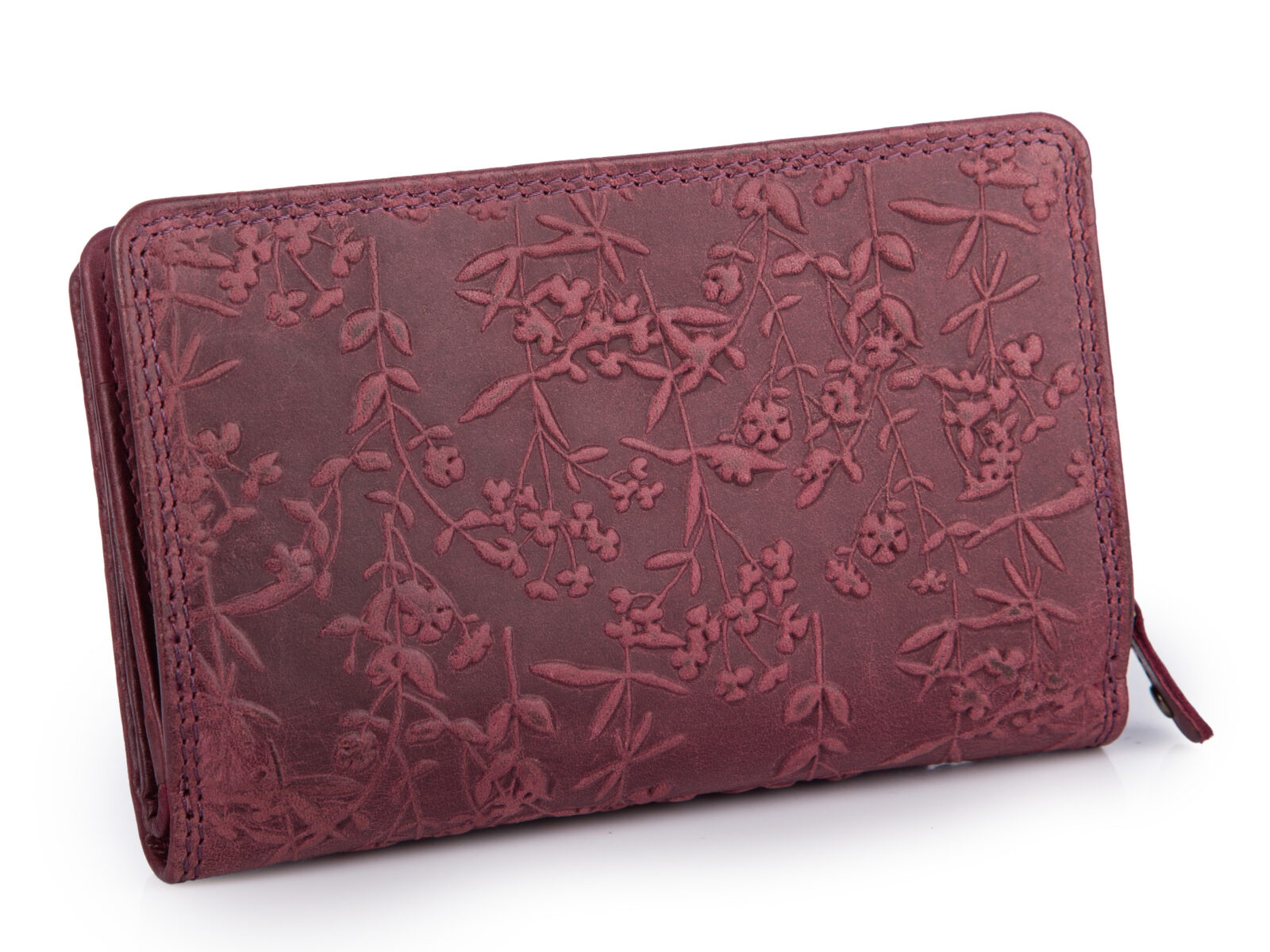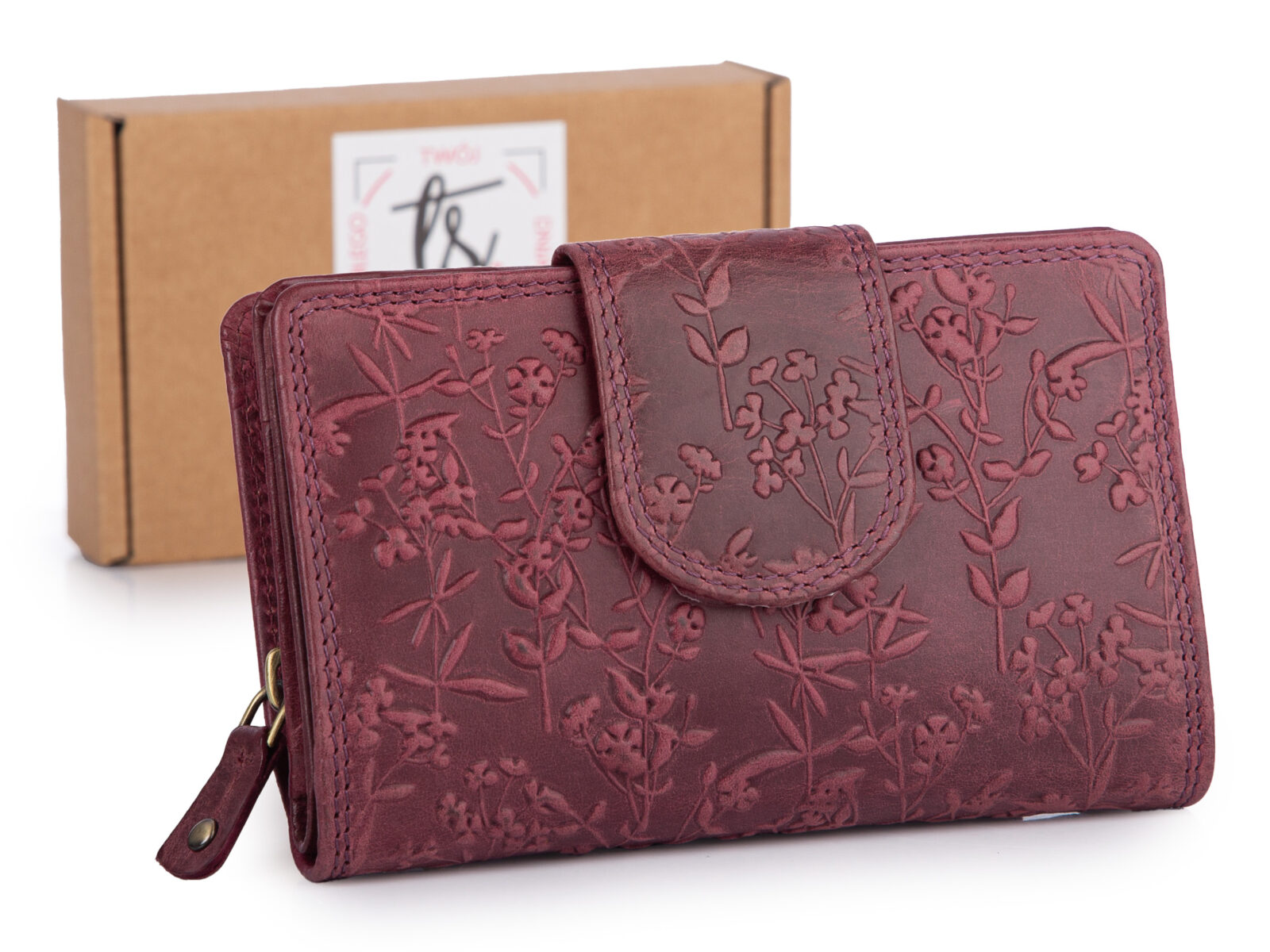 Pojemny, skórzany portfel damski bordowy z tłoczonym kwiatowym wzorem vintage