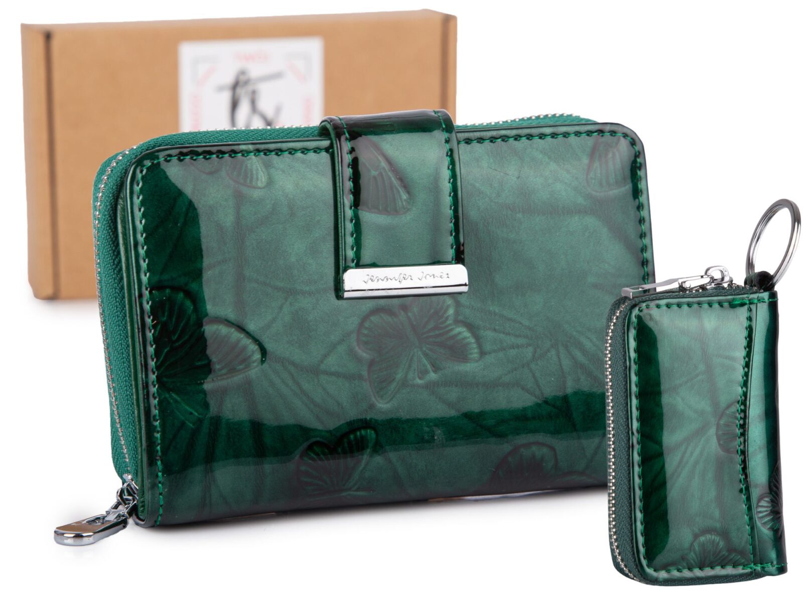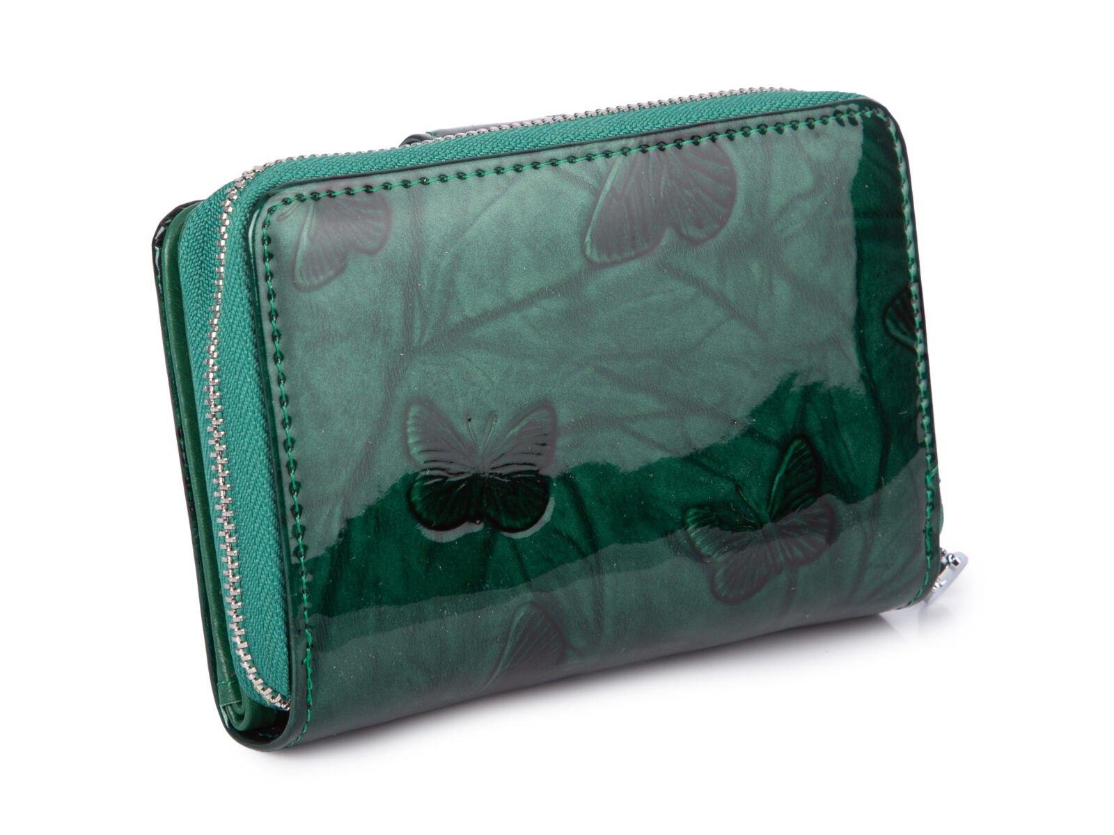 Ciemnozielony, średni portfel damski skórzany z wzorem w tłoczone kwiaty RFID