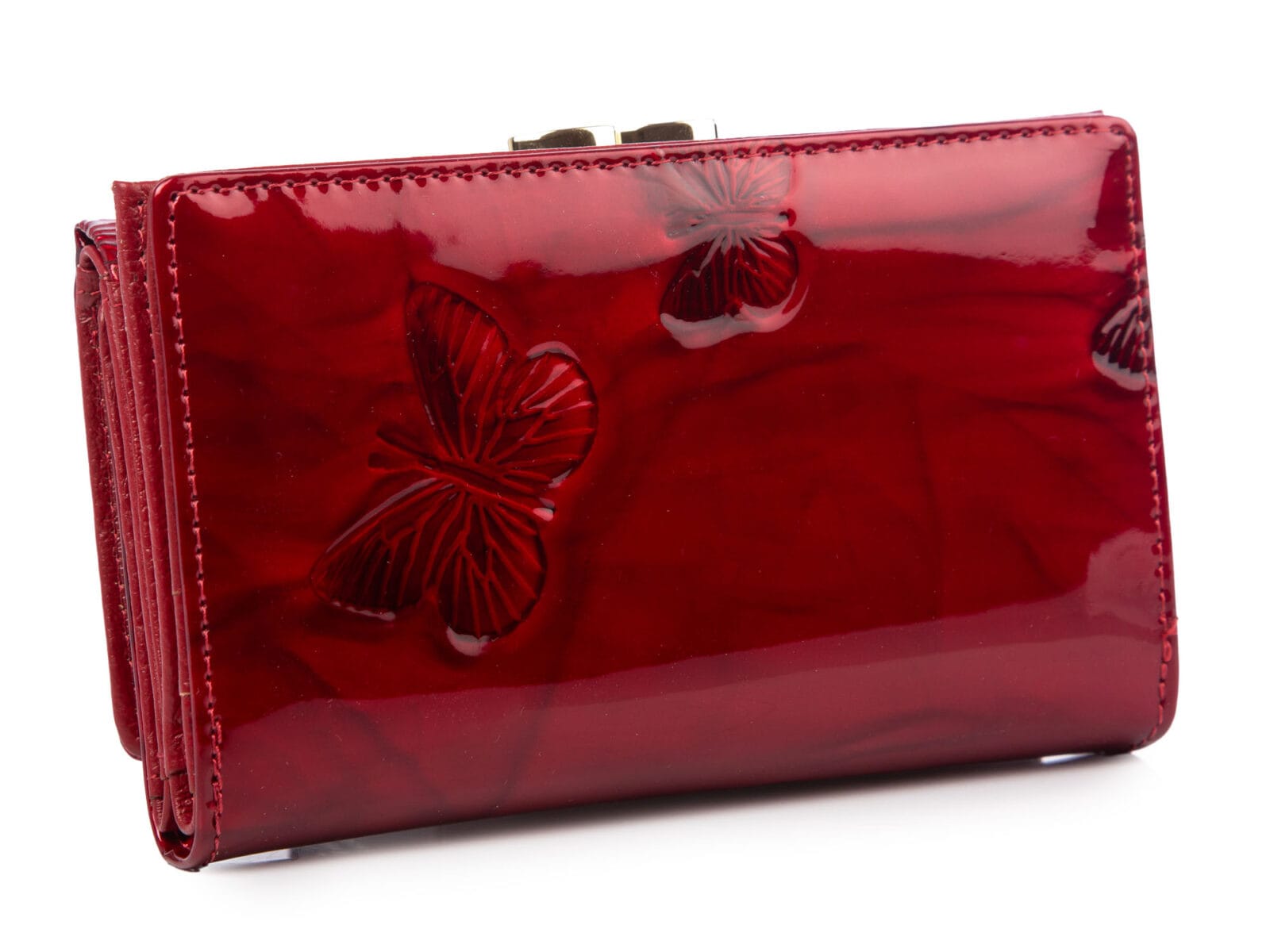 Pojemny czerwony portfel damski lakierowany w motylki zapinany na bigiel i zatrzask RFID