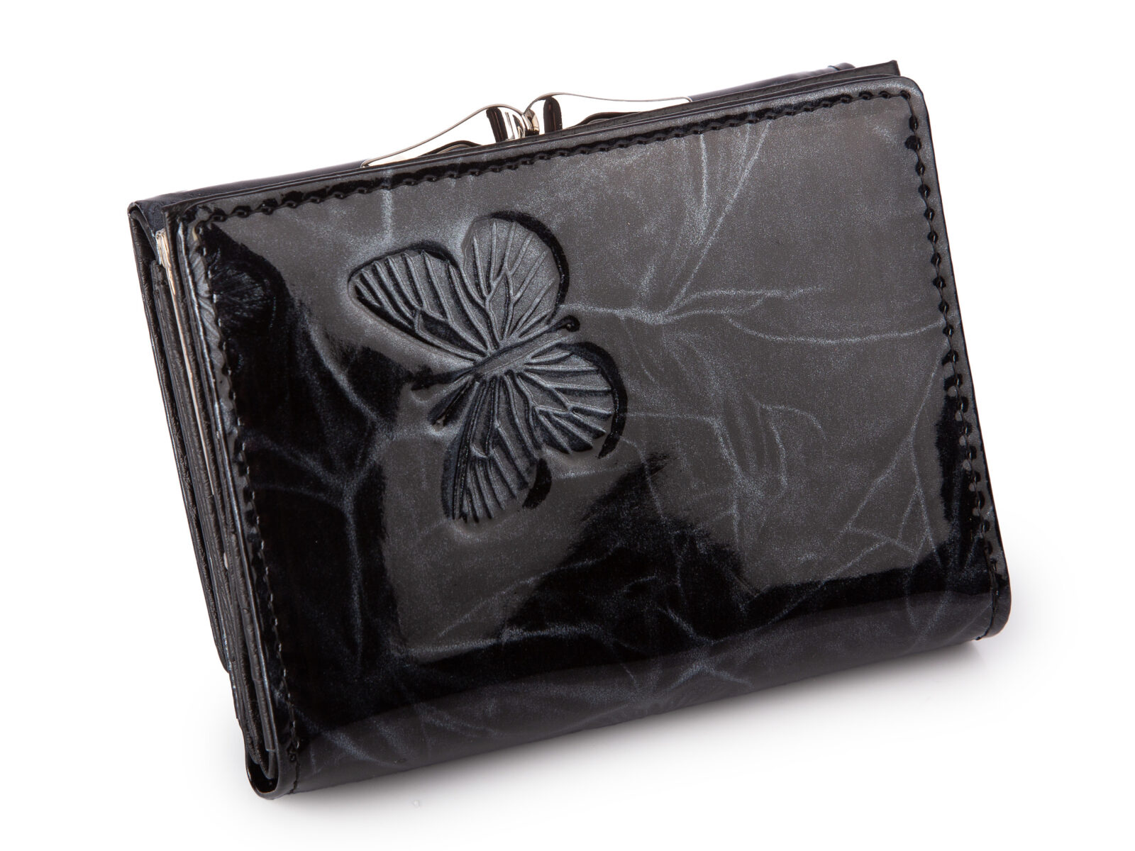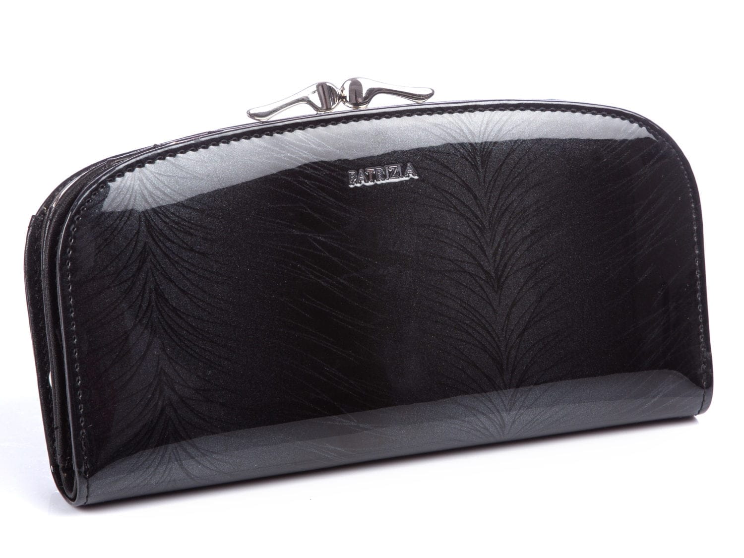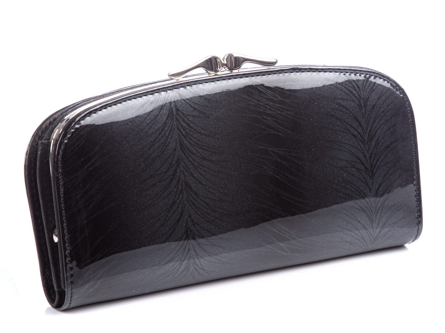 Pojemny czarny portfel damski ze skóry lakierowanej z dwoma kieszeniami na bilon