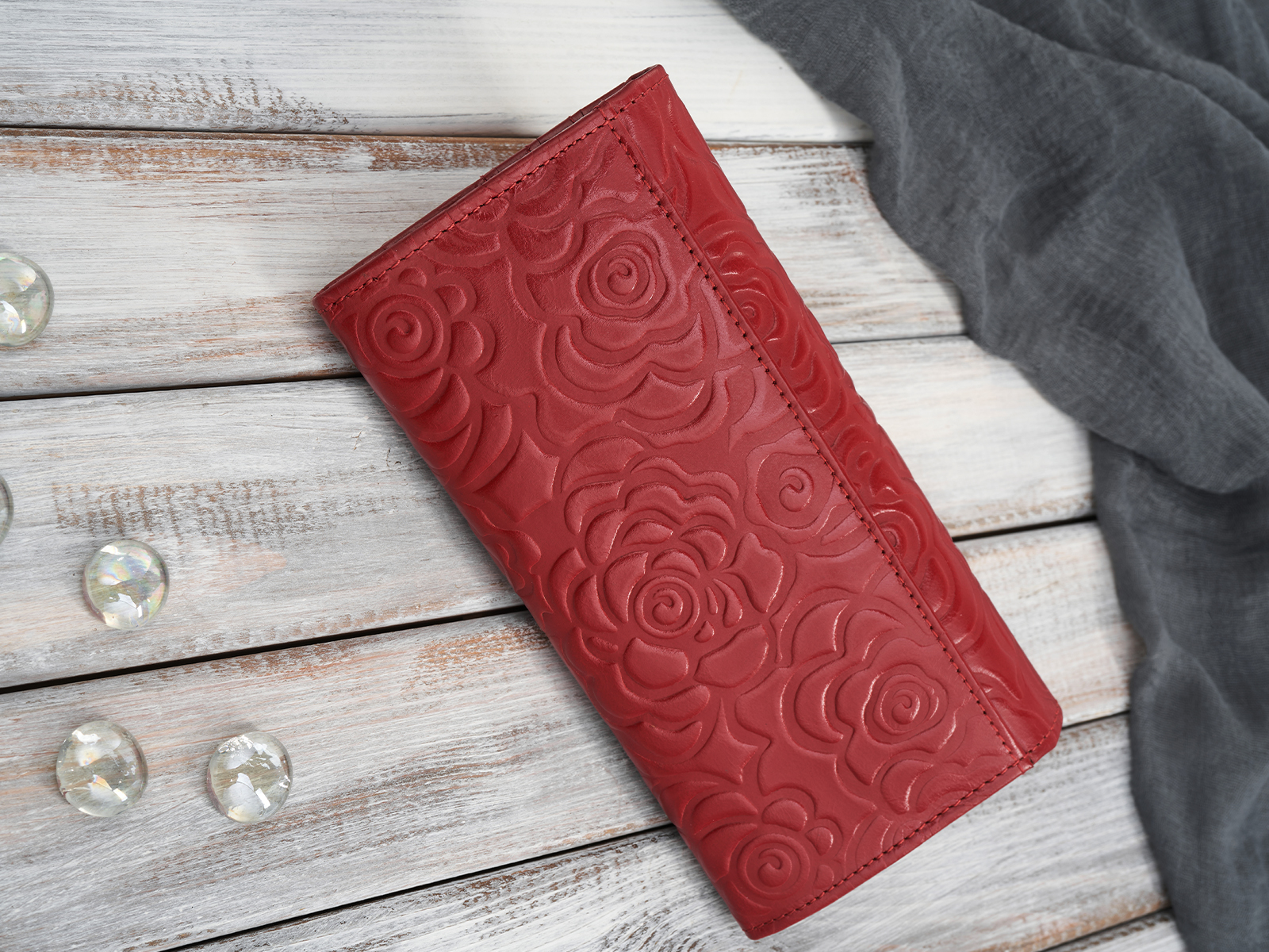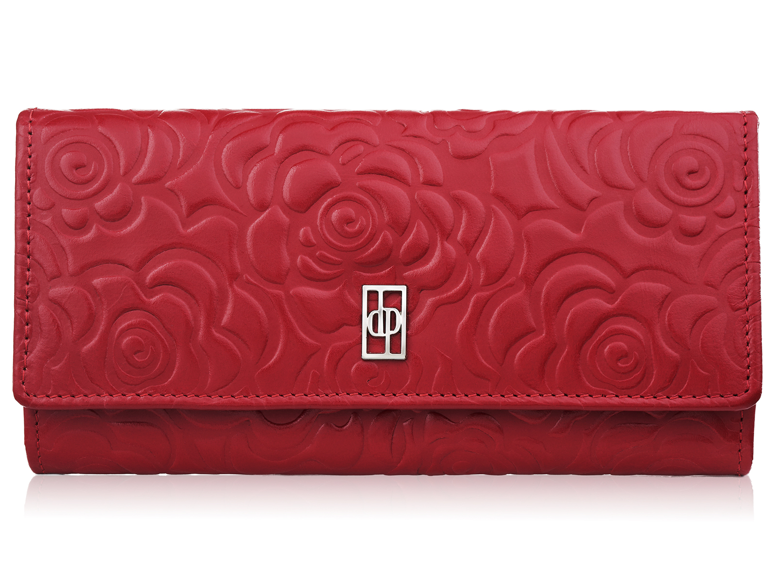 Elegancki, czerwony portfel damski skórzany z tłoczeniem w kwiaty Paolo Peruzzi