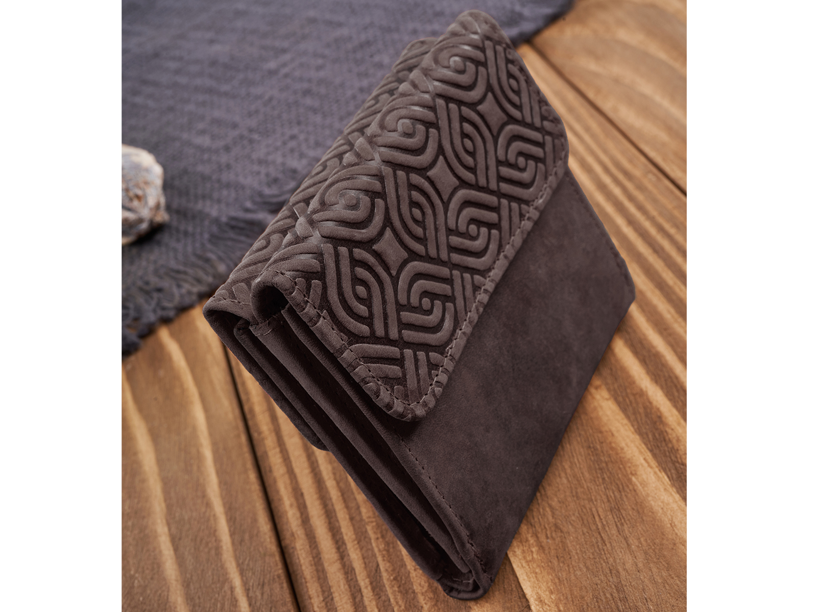 Poziomy portfel damski czarny z zamszowej skóry naturalnej z tłoczeniem w kwiaty