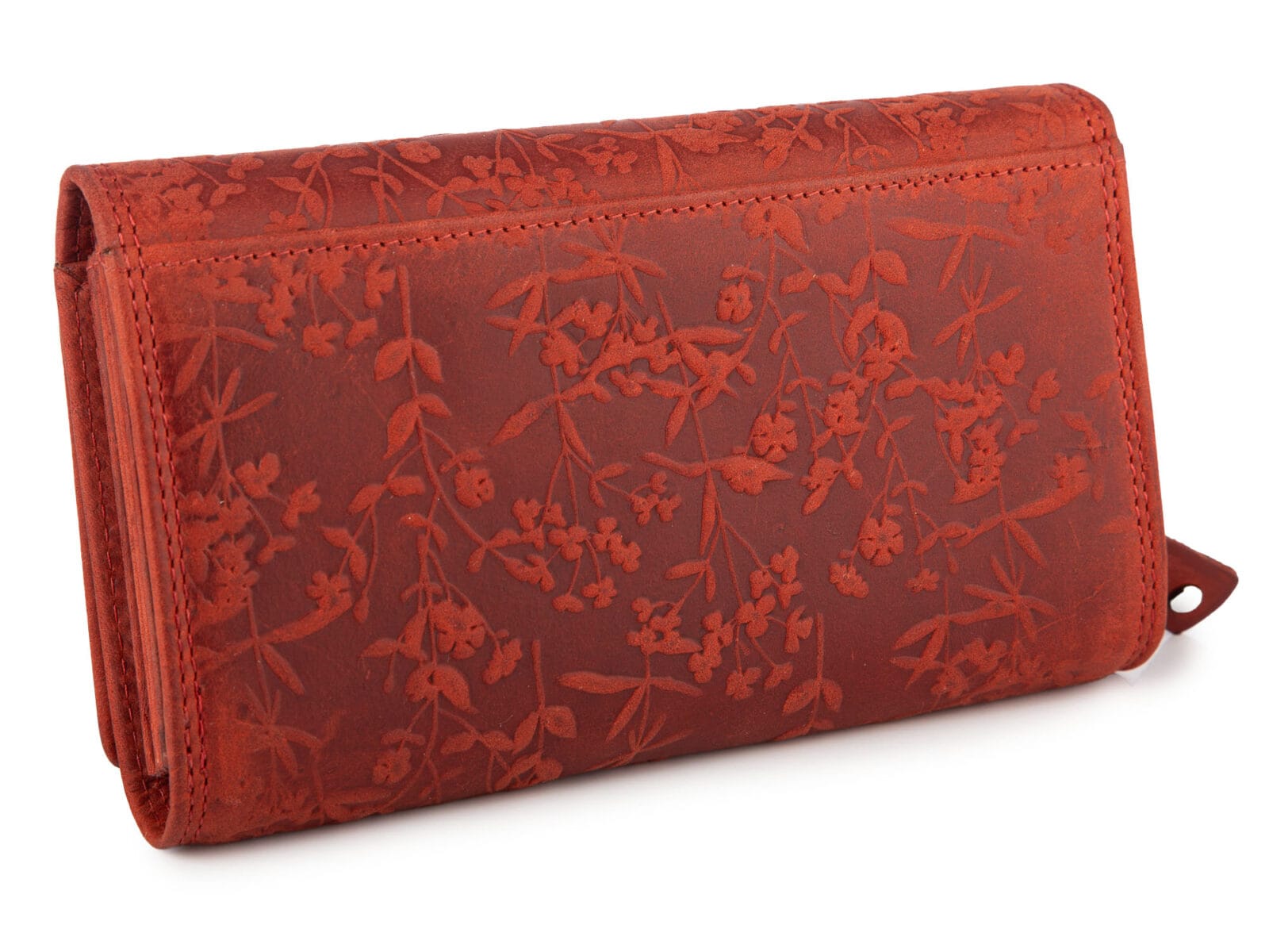 Duży poziomy portfel damski czerwony szyty ręcznie ze skóry naturalnej w kwiaty RFID